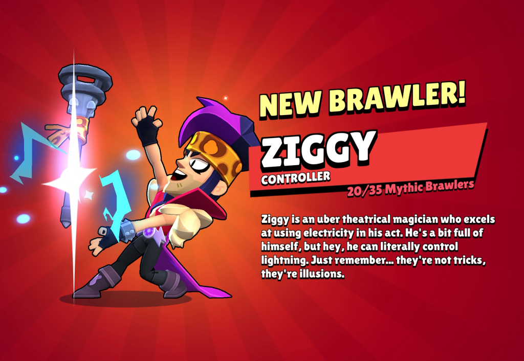 NEW BRAWLER! ZIGGY CONTROLLER Ziggy is an uber theatrical magician who excels at using electricity in his act. He’s a bit full of himself, but hey, he can literally control lightning. Just remember… they’re not tricks, they’re illusions.